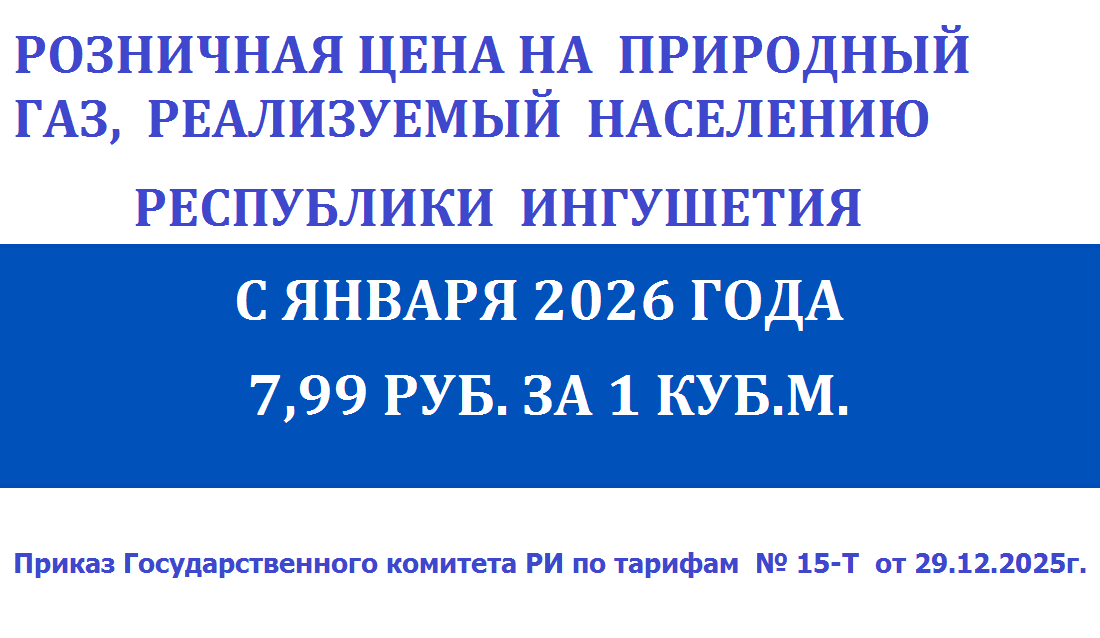 Государственным комитетом РИ по тарифам с 1 января 2026 года утверждена розничная цена на природный газ, реализуемый населению Республики Ингушетия, в размере 7 руб. 99 коп. за 1000 куб. м. (Приказ № 15-Т от 29.12.2025 г.)